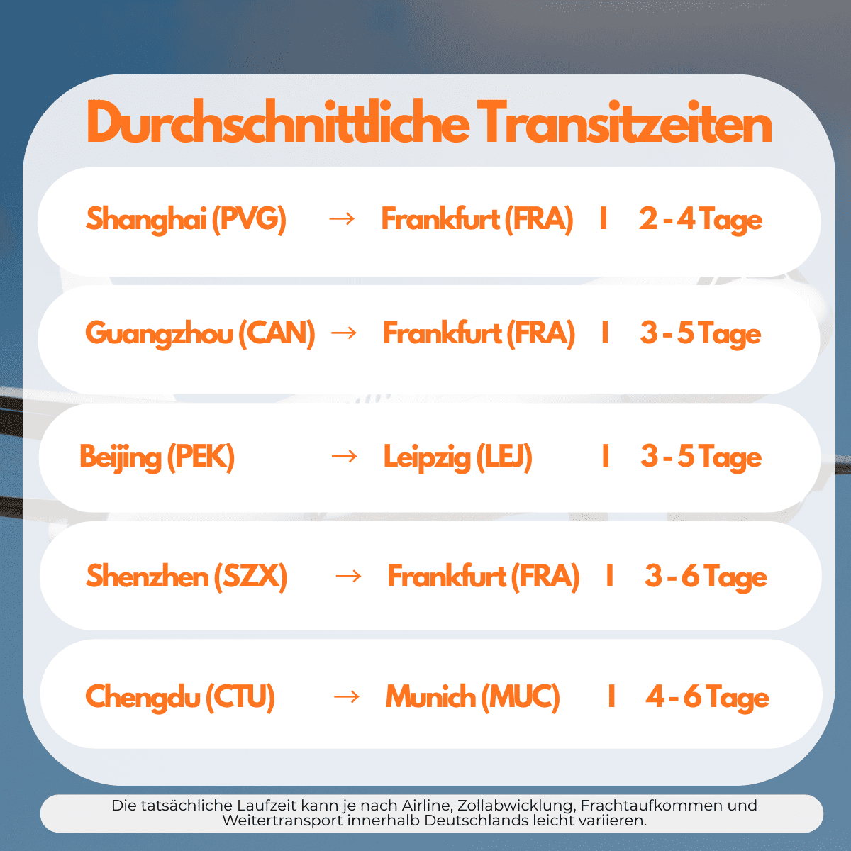 Unsere Übersicht zeigt Ihnen die durchschnittlichen Laufzeiten der wichtigsten Luftfrachtrouten zwischen China und Deutschland, damit Sie Ihre Lieferkette zuverlässig planen können.